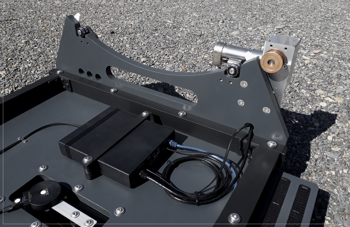 die Kabel von Encoder/Handsteuerbox und Aussparungen für die optionale Montage von Laufrollen statt Teflon- Pads.